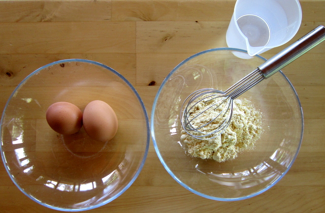 In una ciotola ho messo due cucchiaiate colme di farina di ceci, sale, pepe e, con l’aiuto di una piccola frusta, ho ridotto il tutto a pastella aggiungendo poco a poco 100/120 ml di acqua tiepida, ho aggiunto l’altra metà dell’asparagina ed ho lasciato riposare il tutto per una mezz’ora.